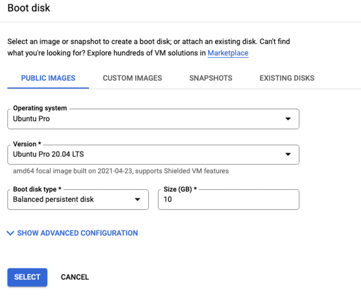 6. In the Boot disk pop-up window, in Operating System, select Ubuntu Pro from the drop-down; in Version, select Ubuntu-Pro-20.04-LTS; keep the rest options as default value and click SELECT. Ubuntu Pro ensures the latest security update, which will be useful when we install the productivity applications.