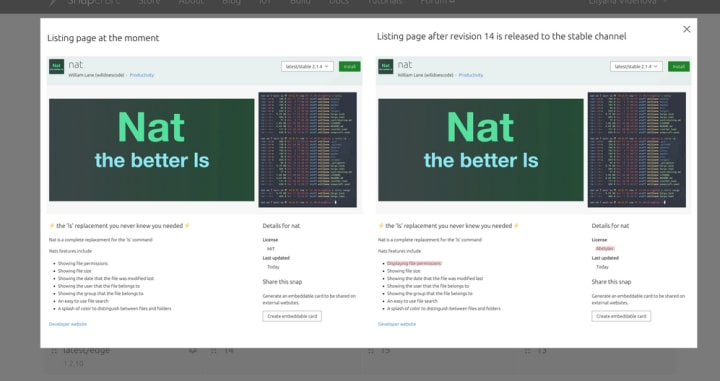 We are working on updating the behaviour for snap releases. When a snap will be released to stable the metadata of the snap will be updated with the latest information from the snapcraft.yaml file. We worked on a visual representation of those changes. This is the proof of concept that the team came with: