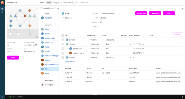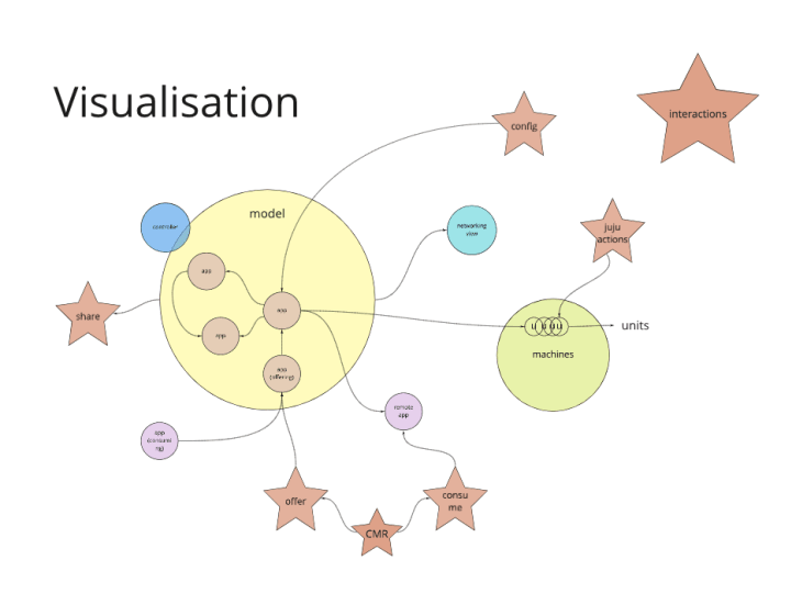 The team is spending some time in workshops on this information architecture definition. In the initial exploration we have defined the relations in the dashboard and actions according to the Juju model structure and elements: