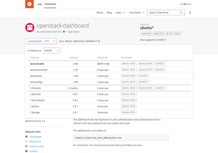 We have done some updates to the visualisation of the different release channels for a charm. The channel map now includes a drop down where users can select which architecture they want to get information about; and we also included more details about which OSs the charm is able to run on.