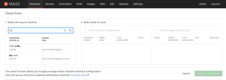Once you select either the network, storage or both, MAAS will clone your source machine into your destination machines.