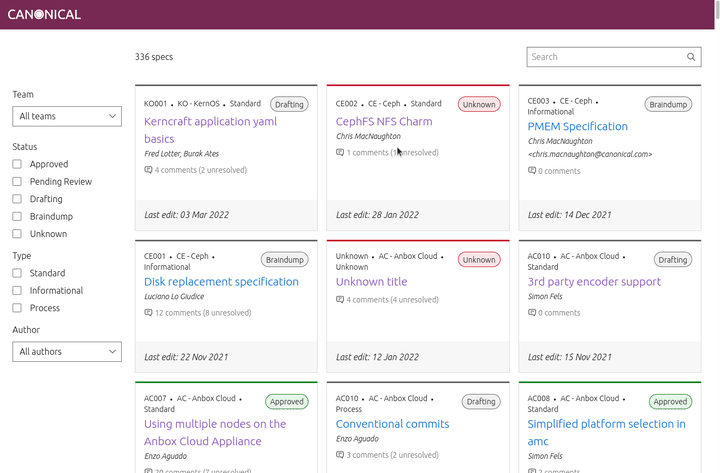 The problem we wanted to solve is that there are a lot of feature/project specifications to agree across Canonical. They can sometimes be hard to find and understand the specs current status and life cycle. We discovered there were also inconsistencies in the way they are written.
