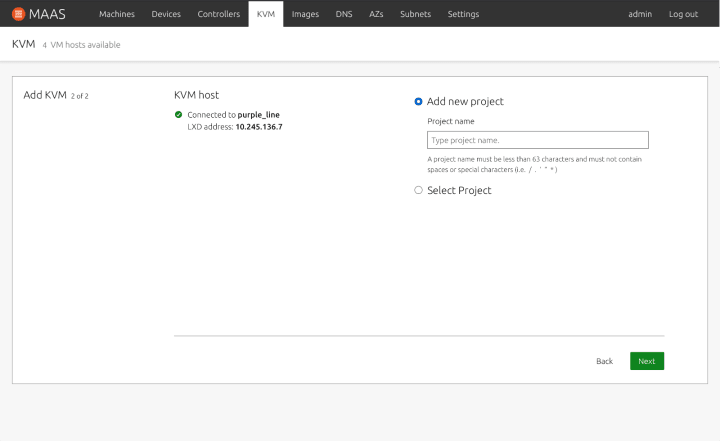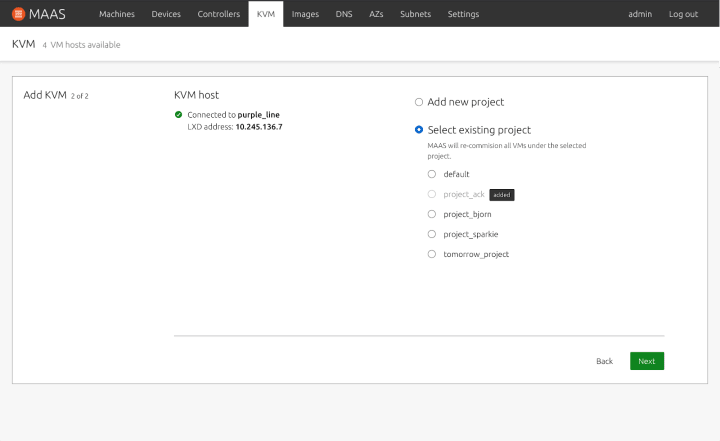 If a user selects an existing project, MAAS will recommission all VMs under that project.