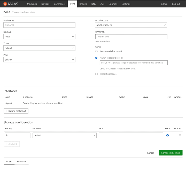 When composing a machine, you may also pin your cores in the UI, by providing the core numbers separated by a comma or providing a range of numbers. Our help text will also guide you to which cores are currently available out of all cores. If hugepages is set up as part of the LXD server configuration, you may also enable that in the project, when you compose a new VM.