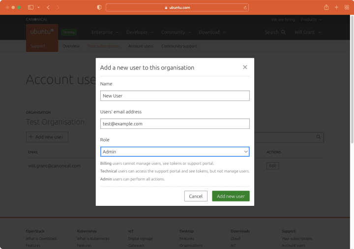 The new “Account users” view in Ubuntu Advantage is available now and lets our customers add, edit and remove colleagues inside their Ubuntu Advantage accounts. We have added permission levels like “Technical” and “Billing” so you can be sure your teammates see the right information without exposing access to sensitive information.