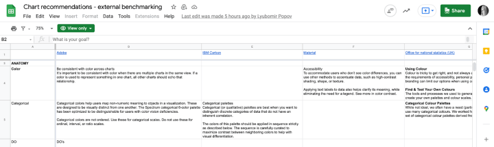We’ve done some internal benchmarking to find all the graphs and charts we use across all our products. Then classified by type and use cases.