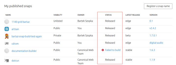 To make it simpler, the team added the latest build status in a column on the snap list page of a publisher. It describes the status of a snap, from building to release.