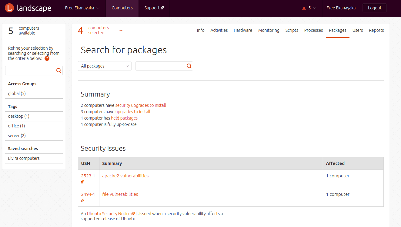 The package management section in the Landscape web UI allows you to easily perform package-related queries across all your registered systems (or a selection of them). This is possible because the Landscape clients running on such systems regularly send to the server information about the state of all available and installed packages. For example, the screenshot below shows that I currently have two computers with security updates available, three with regular upgrades available, one with “on hold” packages (i.e. packages that won’t be upgraded even if they have an upgrade available, see here) and finally one which is up-to-date.