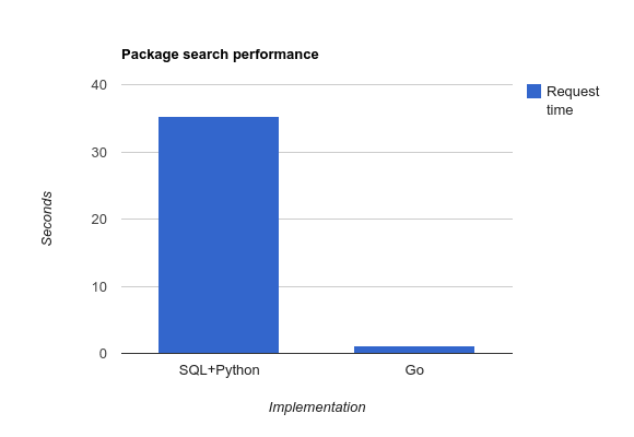 In a relatively small test on our hosted environment the difference in performance is dramatic: without this Go service the package listing page showing updates for 500 computers took 35.26 seconds to load (with a hot database cache), while with the service enabled it took only 1.13 seconds.