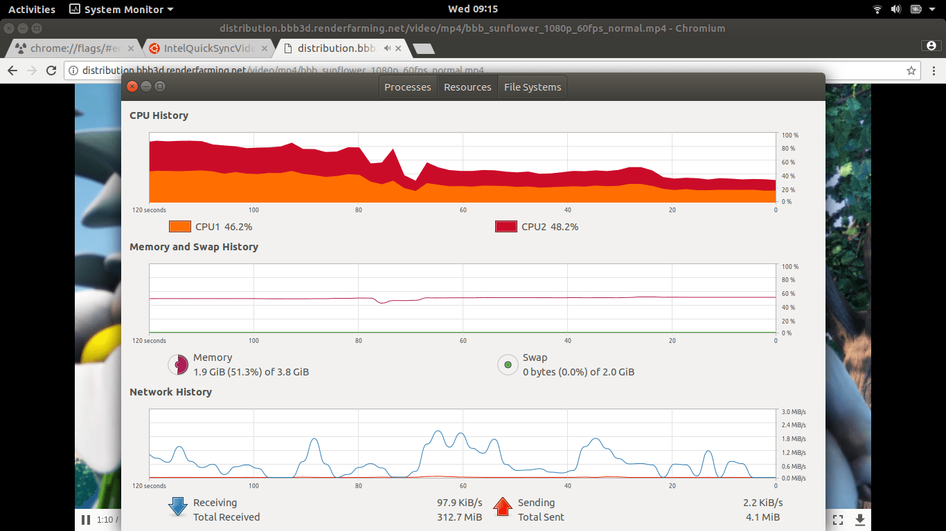 We’re testing some patches to Chromium 60 in Artful to enable video acceleration and we’re seeing roughly a 50% saving in CPU overhead when using VA API. In the screenshot above playing the video without acceleration is on the left and playing with acceleration is on the right. The CPU is Haswell. There are still more bugs to fix, but we’re making progress.