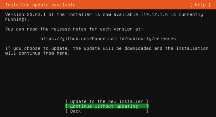 After booting the live Ubuntu Server session on an Internet-connected server the installer will check and notify users if there is a newer version available. Users can either update the installer or skip the update.