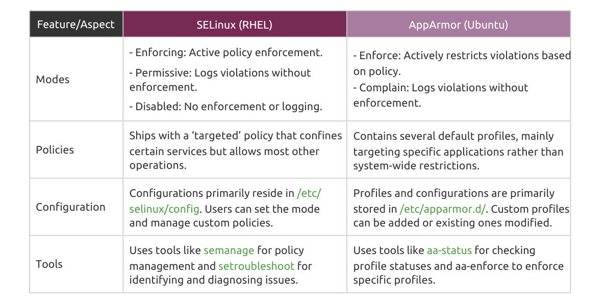 While RHEL-based distributions use SELinux as their default security mechanism, focusing on mandatory access controls, Ubuntu employs AppArmor, which puts emphasis on path-based mandatory access controls.