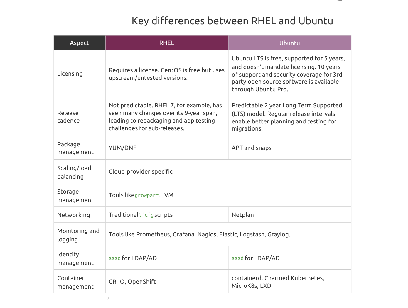 When moving between a RHEL-based distribution and Ubuntu, it’s essential to consider a range of factors. This includes the release cadence and licensing model, package management, service configuration, security posture and other system-level differences.